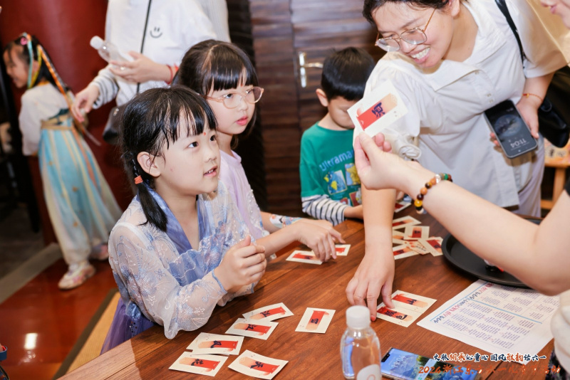 在国学成长仪式中,职工亲子身着汉服,通过国学老师教导,学习正衣冠、跨泮池、点朱砂等东方礼制,引导孩子知礼懂礼、乐学向善;通过叩拜孔子、诵国学经典等庄重仪式,感悟仁义礼智信;通过向父母行三揖礼,表达孩子对父母养育教习的感恩之情。礼毕,职工亲子共同在祈愿牌上写下心愿,在孔庙放飞初心和梦想。现场还设置了国潮趣玩游戏区,孩子们在蹴鞠、投壶、旋转陀螺游戏中大展敏捷身手,在“诗词飞花令”挑战里温故知新、以诗会友。